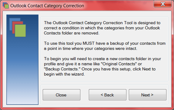 In the end, it is ALWAYS good to have a backup of you contacts. and as it turns out this customer did – albeit they were 6 months old. The problem was that the “decategoried” contacts they had in Outlook were fairly updated with notes, changed e-mail and phone numbers, versus the properly categorized backup’s that were 6 months old. Enter the tool…